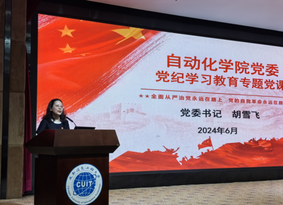 根据上级相关精神和学校党建工作总体安排,7月3日上午,学院党委书记胡雪飞在国际会议厅为学院全体党员师生讲授党纪学习教育纪律党课。
